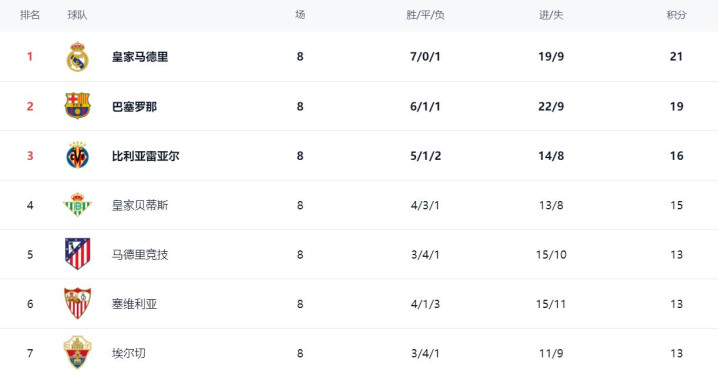 在积分榜上,皇马以21分高居榜首。巴萨输球,依然是19分,只能排名第2。比利亚雷亚尔以16分排名第3。第4的是皇家贝蒂斯,拿到15分。而马竞只拿到13分,排名第5。塞维利亚、埃尔切和毕尔巴鄂竞技也都是13个积分,排名第6到第8。